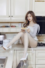 A woman in black stockings sitting on a chair.